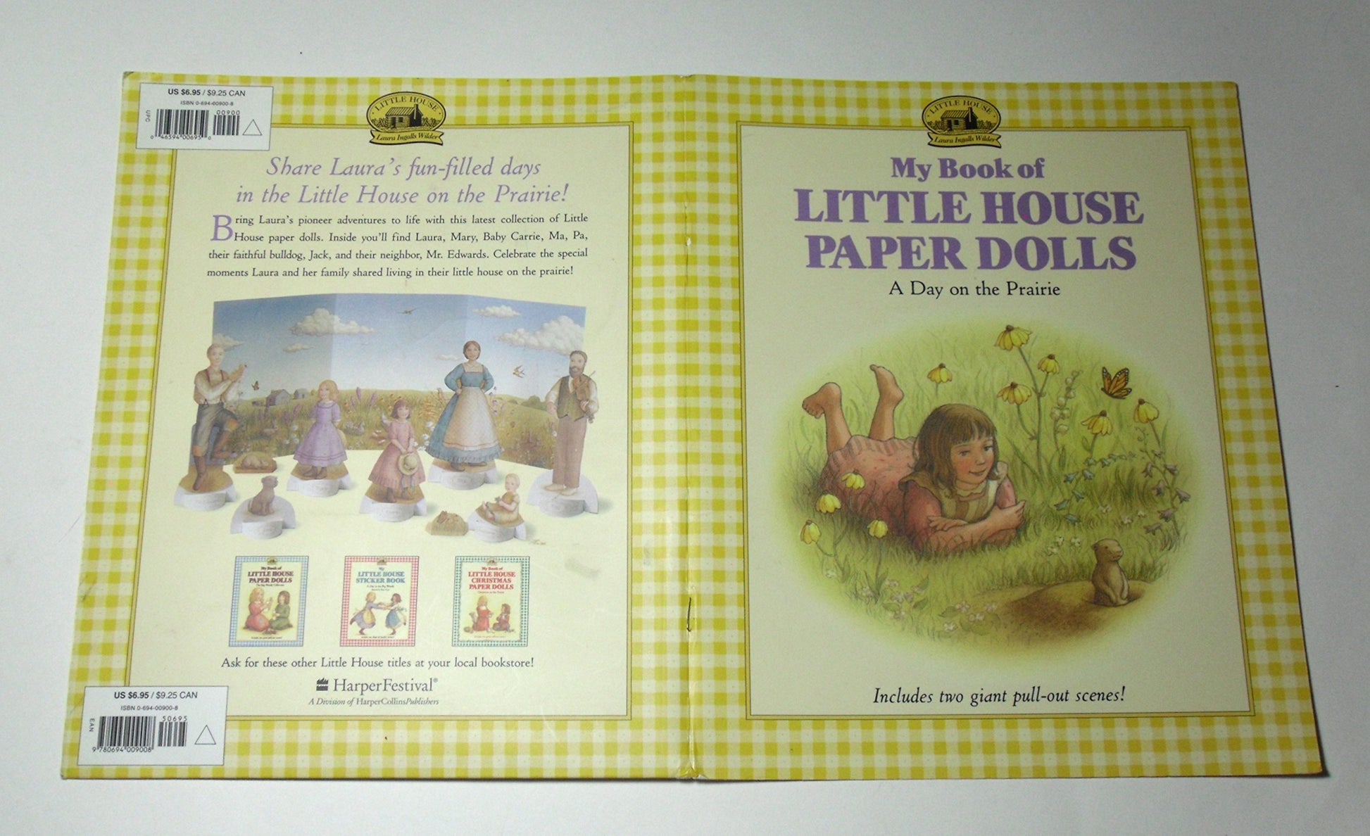 Paper dolls include Laura, Mary, baby Carrie, Ma, Pa, and the Ingalls’ trusty bulldog, Jack.